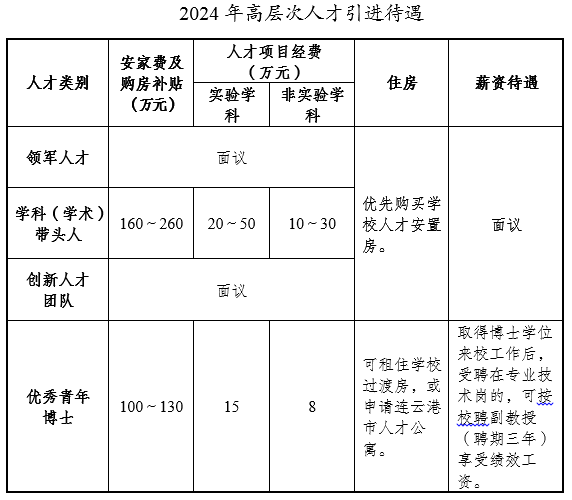 (4)引进博士可享受连云港市1000元/月生活补贴,发放三年;享受学校1000元/月租房补贴,发放三年(入住连云港市人才公寓期间减半发放)。