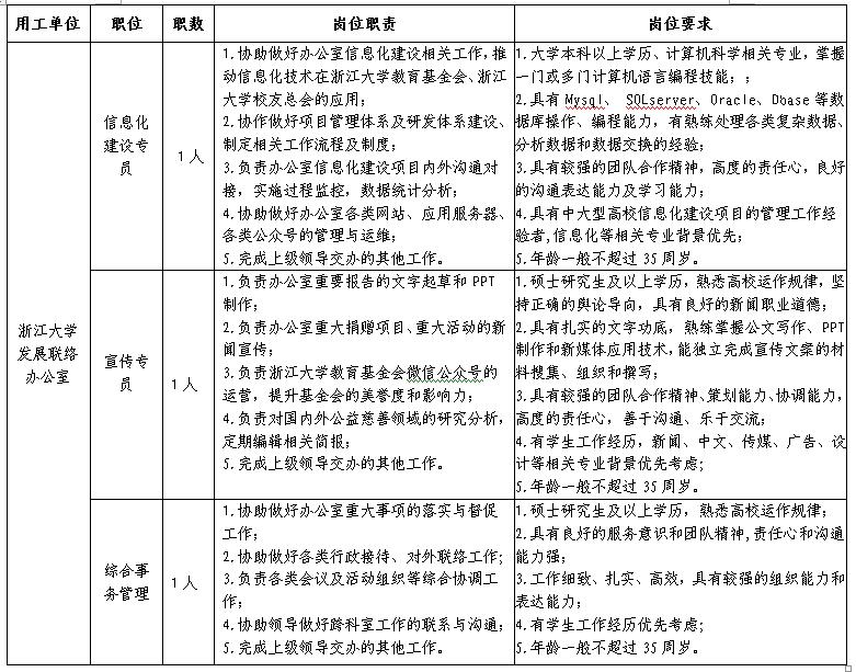 本单位拟公开招聘员工3名,派遣至浙江大学发展联络办公室。发展联络办公室是负责学校发展联络、校友事务管理、社会办学资源拓展的直属机构,与浙江大学教育基金会秘书处和浙江大学校友总会秘书处合署办公。