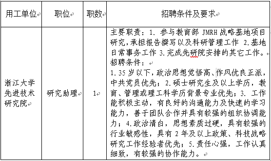 本单位因科研管理工作需要,公开招聘从事JMRH战略研究助理工作1人,派遣至浙江大学先进技术研究院。招聘将坚持公开、公平、竞争、择优的原则,凡符合招聘岗位要求者,请将个人简历(包括学习、工作和研究经历)以及其它证明本人能力、水平的相关资料发至联系邮箱gfyjy@zju.edu.cn,邮件标题注明:应聘岗位+本人姓名+硕博英才网。之后统一发放面试通知,期间如有问题,请邮件联系,经面试考核后择优录取,待遇面议。