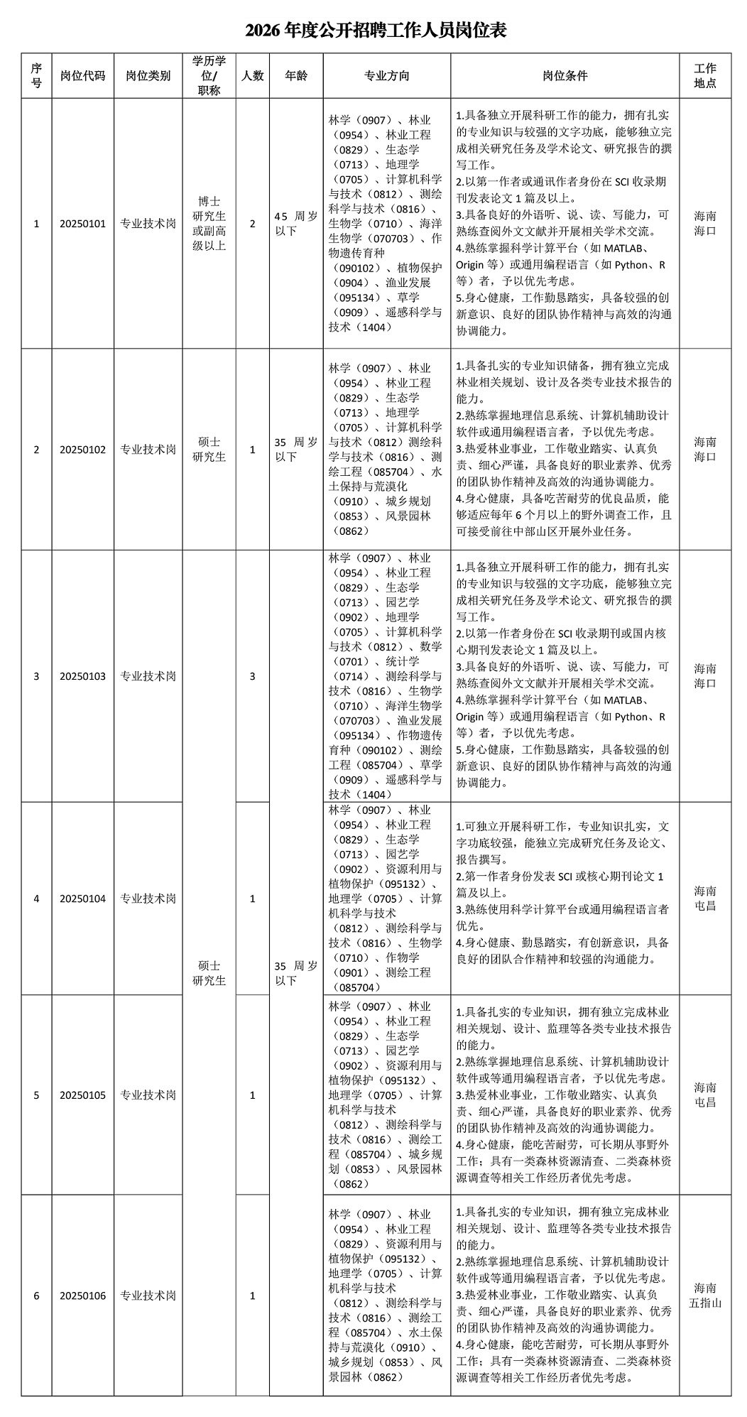 根据上级行政主管部门批复意见,为适应我院科研事业发展需要,优化人才招聘条件、拓宽引才范围、提升人岗匹配度。现结合2025年度招聘报名情况,对2026年度专业技术岗位相关条件进行优化调整。海南省林业科学研究院(海南省红树林研究院)2026年度公开招聘工作人员共设置6个岗位,计划招聘9人。